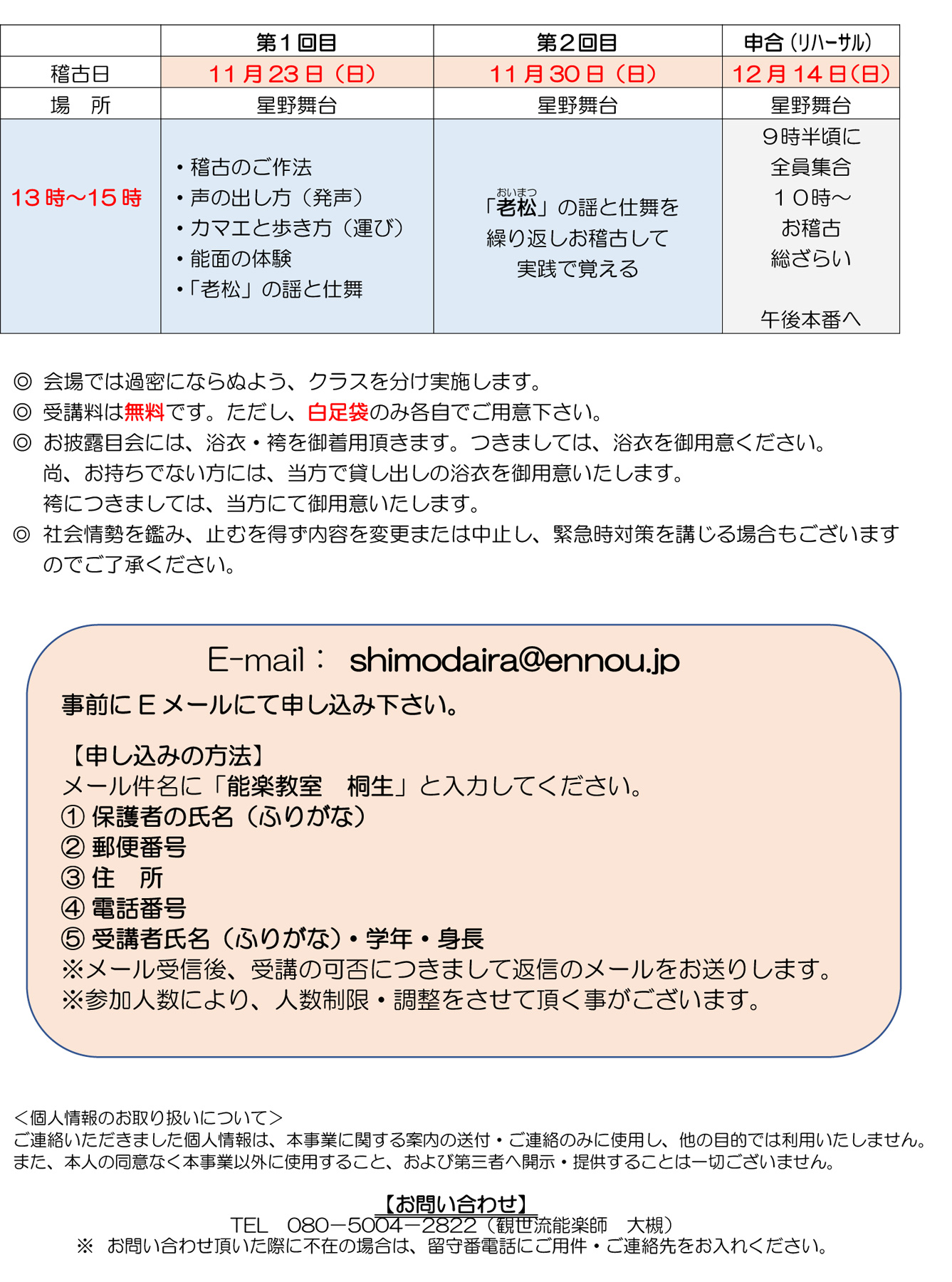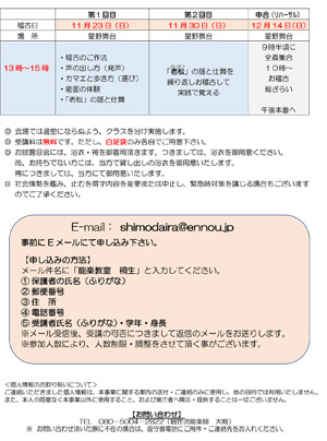 メール件名に「能楽教室 吉岡」と入力し、以下の内容をお送りください。